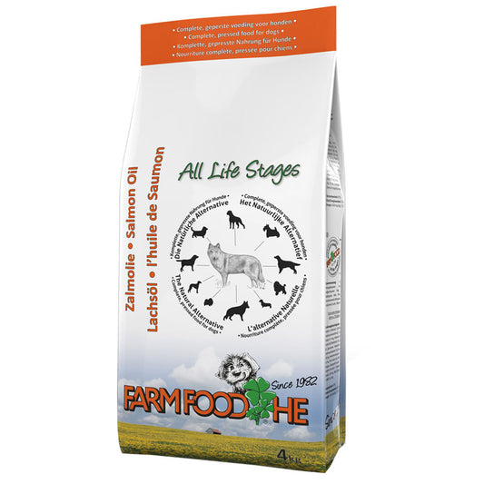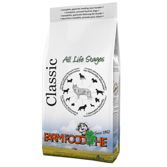 Farm Food HE is a premium High Energy and Natural, Pressed Dog Food suitable for every dog, regardless of age, activity or breed. We call this the All Life Stages concept and is based on the fact that digestion in dogs is still the same as that of their ancestor, the wolf. In nature, wolves and other canines eat the same prey, irrespective of their age; young and pregnant animals eat more and older animals eat less. All this contributes to puppies growing very evenly without annoying growing pains.