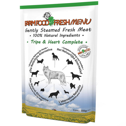 Even when you want to switch an older dog over to a different food, for instance Farm Food HE, it is recommended to do an ‘intestinal flora build-up’ first. This treatment consists of giving Farm Food Fresh Tripe and Heart Complete for 10 to 14 days. This is the foundation the further health of your dog is built on. We recommend including regular ‘maintenance’ with Farm Food Fresh Tripe and Heart Complete.